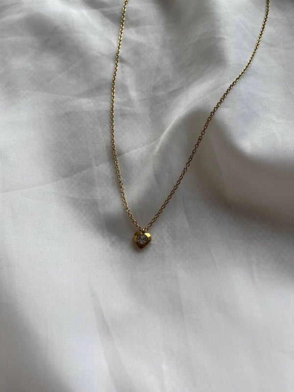 Halskæden er lavet af en kæde i forgyldt rustfrit stål, et vedhæng i forgyldt rustfrit stål og en lås i forgyldt rustfrit stål.